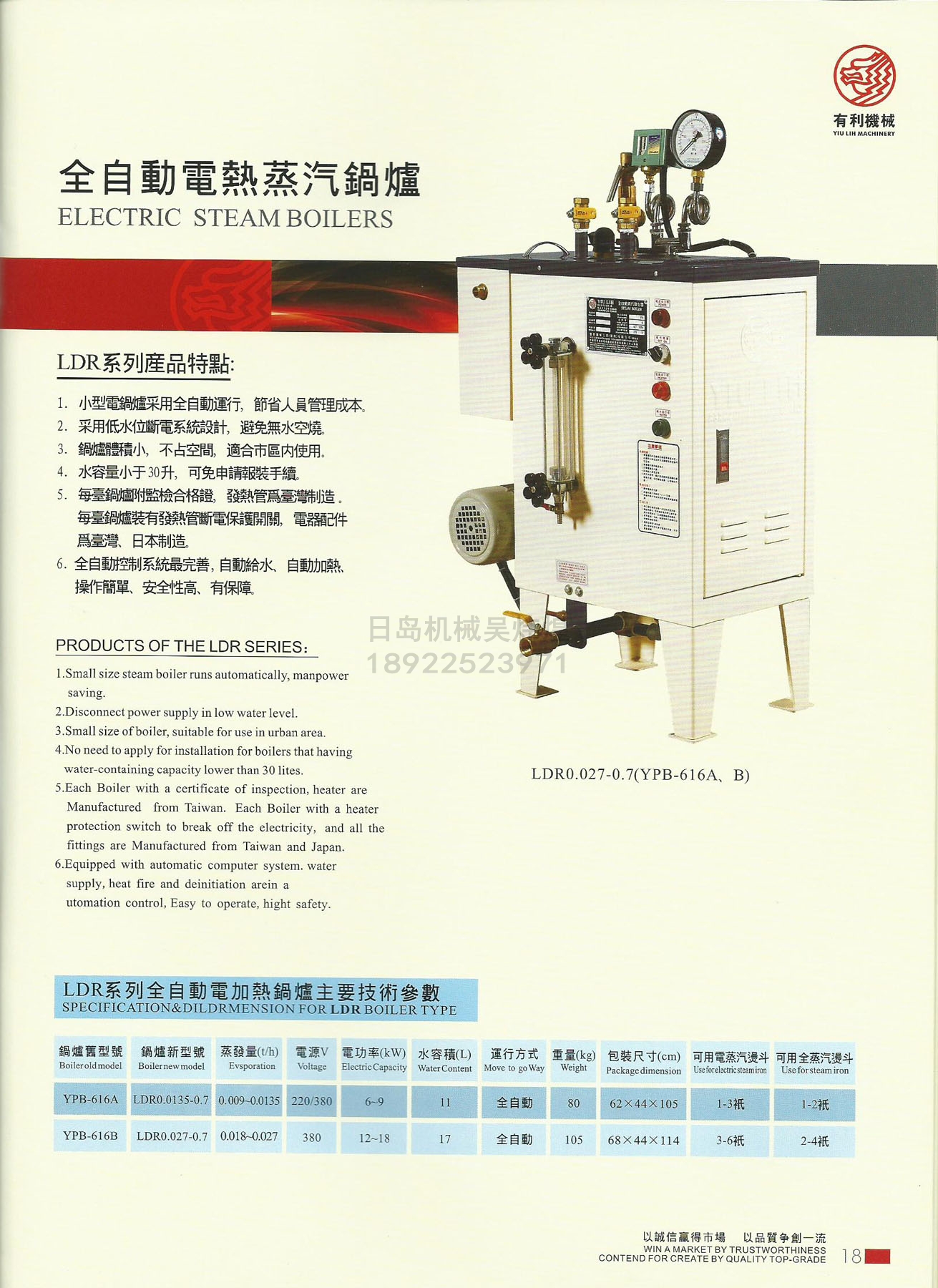 | 產(chǎn)品名 | 有利牌全自動(dòng)電熱蒸汽鍋爐 | |