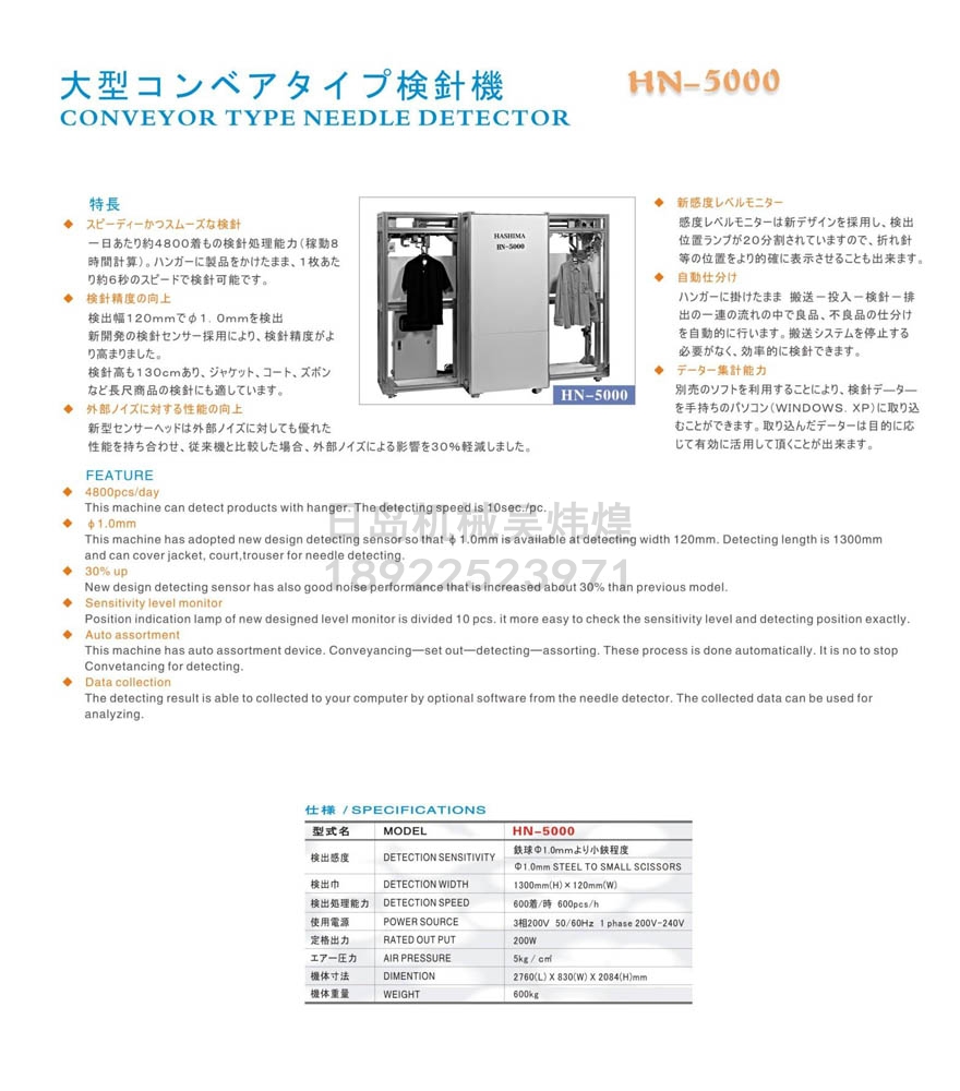 ●敏捷平滑的檢針機 一天大約可以檢針4800件衣服,(以工作8小時(shí)計算) 將成品掛在衣袈上,可以以1件6秒的速度檢針. ●檢針精度的提高 在檢出幅度120mm(寬度)處,可以檢出φ1.0mm的鐵球 采用新開(kāi)發(fā)的檢針探測頭,更加增加了檢針精度. 檢針高度有130cm,適宜于夾克,外套,長(cháng)褲等長(cháng)尺寸商品的檢針. ●抗外部干擾性能的提高 新型線(xiàn)圈可以大幅度遮斷外部噪音,振動(dòng)的影響,與以前的機器相比較,對外部干擾的影響降低了30% ●新型感應度水平監控 采用了新型的感度水平監控器,檢出位置的燈分為20盞,可以正確表示出斷針等混入物的位置. ●自動(dòng)分離 將成品掛在衣袈上,在搬送-投入-検針-排出的流程中,將自動(dòng)將良品、不良品分開(kāi)檢出.不需要將皮帶停止,可以提高檢針功效. ●數據計算功能 可以在自己的電腦(WINDOWS.XP)中利用其他軟件讀取檢針數據.對讀取的數據可以按自己的目的有效活用 |